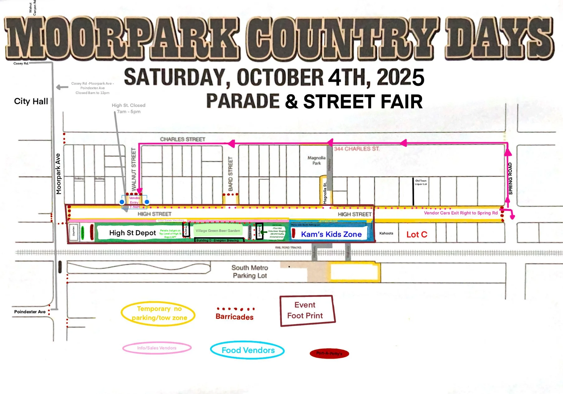 - Parade Participant Drop off &/or Pedestrians participants: - Head North on Spring Rd, Turn Left on Charles St, Drop off at Moorpark Civic Center, then walk to Check-in at Casey Rd.
