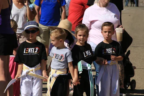 - DRESS CODE: Your parade shirt is NOW ready for pick up! Students will wear LEVEL 3 parade shirt (or any LEVEL 3 shirt if you missed the parade shirt order deadline) with black or white Gi-pants or shorts, belt optional. Please avoid wearing any items that cover your t-shirt design - the goal is to look uniform and represent! We will have a small wagon for backpack storage. Family members of students - wear a LEVEL 3 shirt if you have. If not, then wear any combination of top and bottoms in black, white, red, orange, or yellow with comfortable walking shoes. Dress for the weather - hat and sunglasses are okay. Be sure your apparel is a clean and respectful representation of our studio (nothing stained, tattered, torn, cut, political, polarizing, or inappropriate, etc).