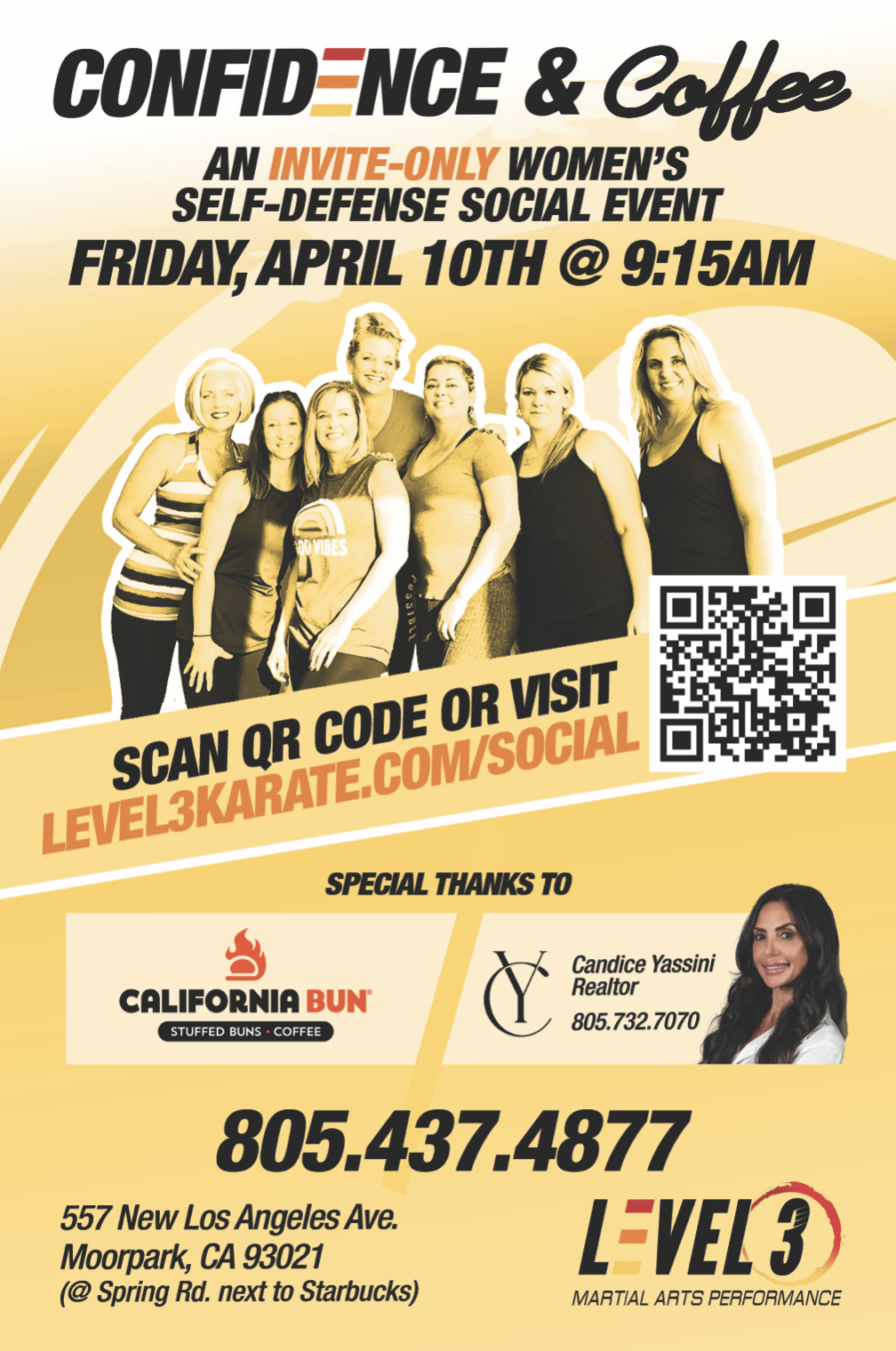 Candice and I are excited to have you join us for CONFIDENCE & COFFEE, an event just for our local Moorpark ladies. My goal is to help further brand awareness in our community by having you experience LEVEL 3 - free - so you feel how approachable and fun self-defense can be for anyone and spread the word. BUT DON’T WORRY…